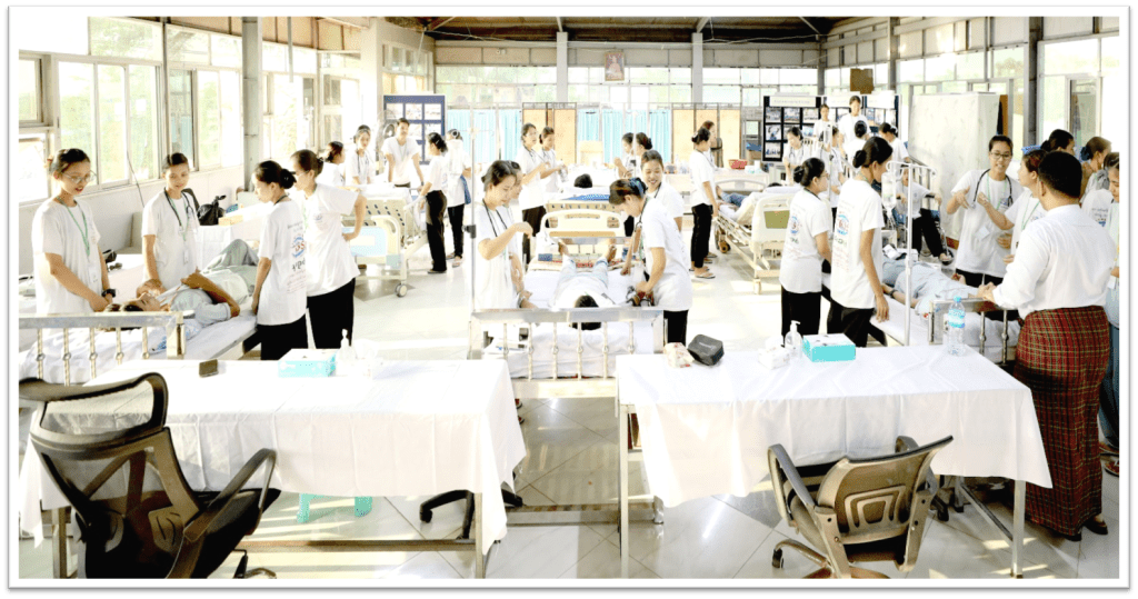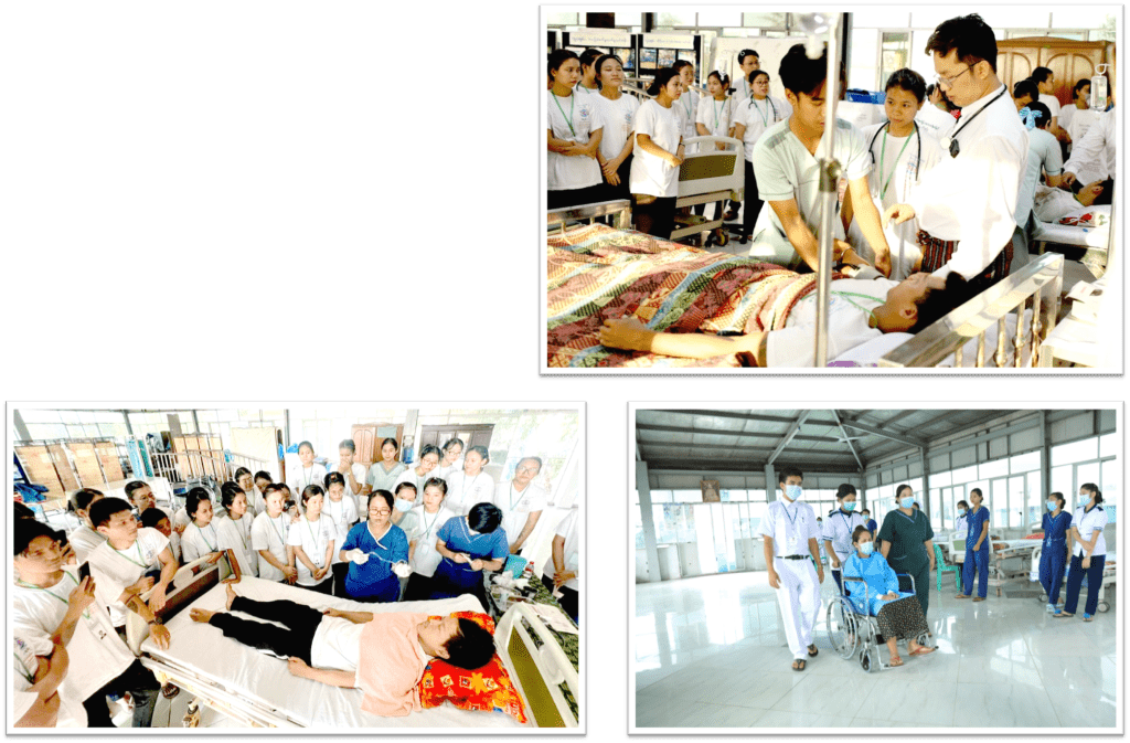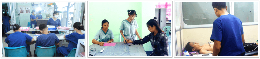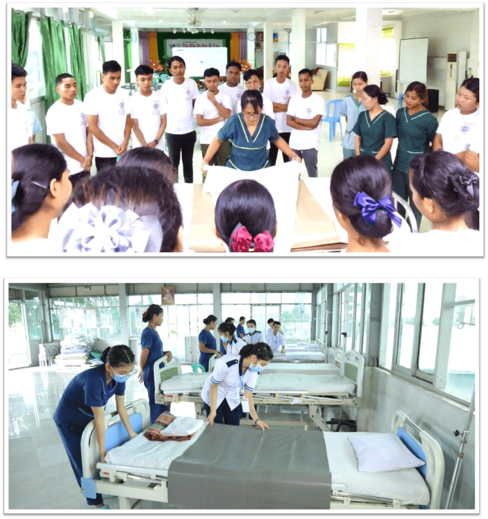 သုခစုစံအထူးကုဆေးခန်း၊ ဓါတ်ခွဲခန်း၊ ဆေးခန်း၊ ဆေးဆိုင်တွင်လက်တွေ့သင်ကြားချိန် ၂ လ အတွင်း လက်တွေ့သင်ကြားလေ့ကျင့်ရာတွင် အနာဆေးထည့်ခြင်း၊ အောက်စီဂျင်ပိုက်တပ်ခြင်း၊ သွေးပေါင်ချိန်တိုင်းခြင်း၊ ဆီးချိုသွေးချိုစစ်ဆေးခြင်း၊ ဆီးပိုက်သွင်းခြင်း၊ လက်ဆေးပုံနည်းစနစ်၊ အိပ်ယာပြင်ဆင်ပုံ၊ ECG ဆွဲခြင်း၊ လူကြီးပြုစုနည်းများ၊ ကလေးကိုင်တွယ်နည်း၊ အရေးပေါ်ကုသနည်းများ၊ ရှေးဦးသူနာပြုနည်းများ စသည့်နည်းစနစ်များစွာလက်တွေ့လေ့ကျင့်သင်ကြားပေးပါသည်။